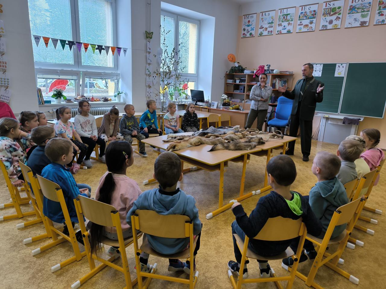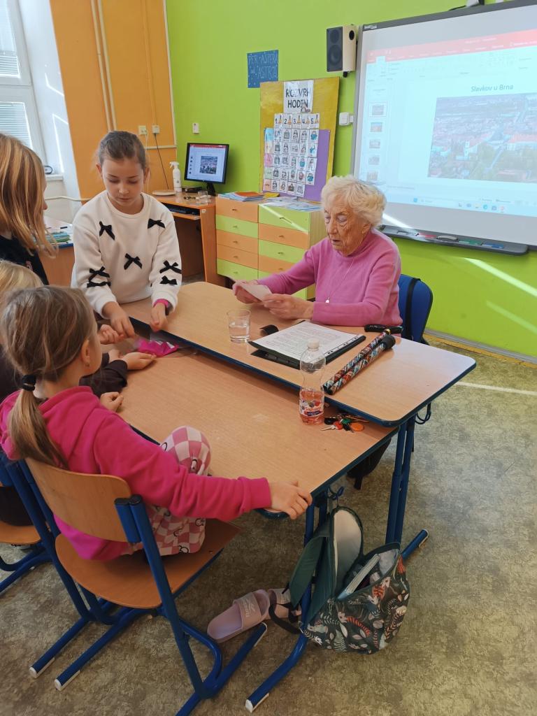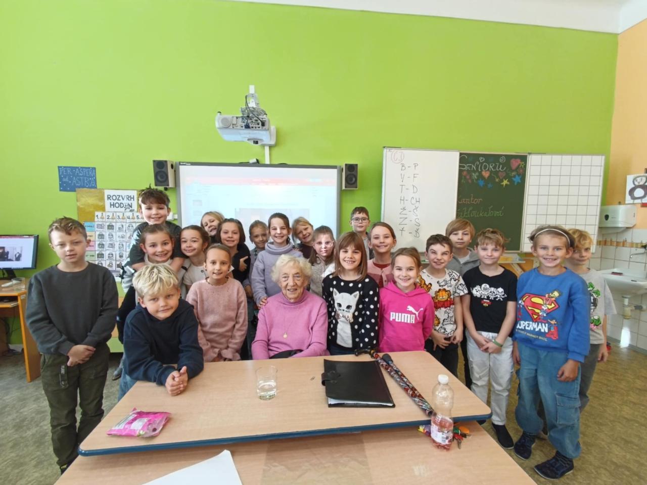 Do 1.A zavítala paní Anna Kašpárková, se kterou si děti upekly ve školní kuchyňce ovocné košíčky a marokánky, povídalo se také o tom, jak si dříve děti hrály a jaké měly hračky. V 1.B přečetla dětem bývalá učitelka mateřské školy paní Marcela Opichalová pohádku, kterou pak společně zdramatizovali a sehráli loutkové divadlo, a v 1.C zaujal děti bývalý vedoucí lesní správy pan Zdeněk Horák svým vyprávěním o myslivosti, které doplnil ukázkami paroží a vyčiněné kůže.