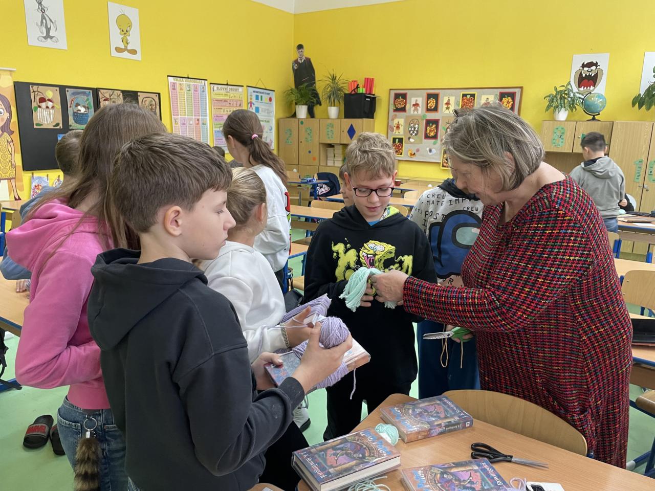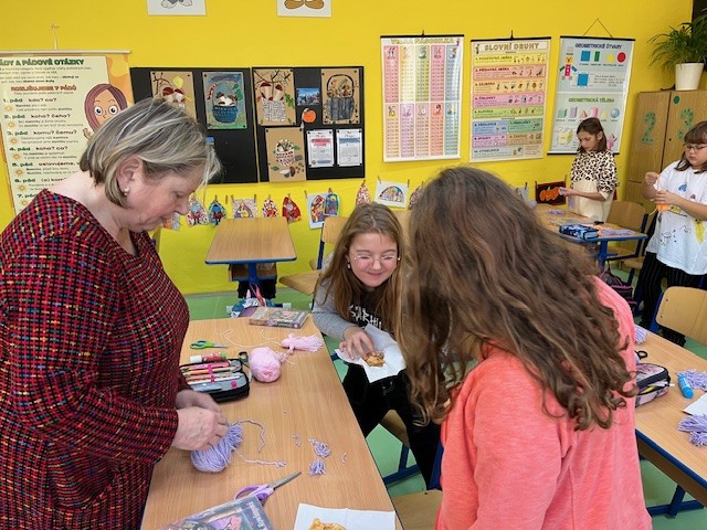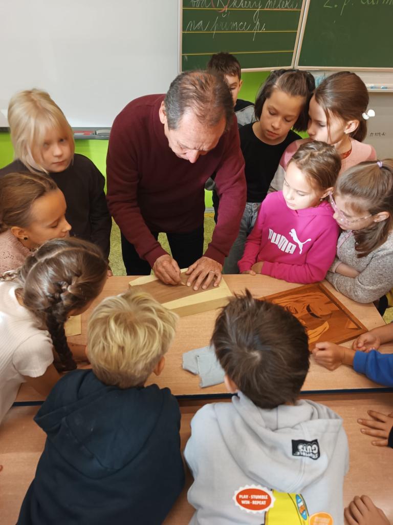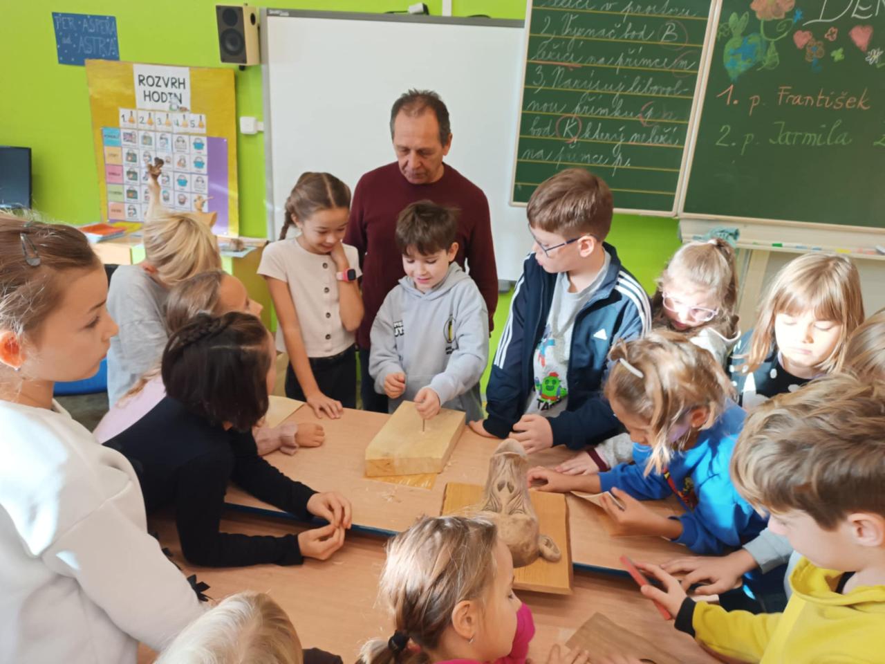 Žáci ze 3.A se vypravili za paní Ivanou Grolichovou do čalounictví. Tento pojem neznali, a tak ani nevěděli, co je čeká. A byli mile překvapeni! Zhlédli ukázky dřívějších prací i to, jak se používají jednotlivé nástroje, látky a knoflíky. Nejvíce je však bavila samotná činnost – nadšeně se pustili do výroby látkových knoflíků, vyřezávání molitanu, práci s raznicemi a samozřejmě nejlepší bylo nastřelování sponek. Ve 3.B se vystřídaly hned tři návštěvy. Nejprve děti seznámil pan František Kantor s prací řezbáře a umožnil jim si jednotlivé řezbářské činnosti vyzkoušet. Všichni toho jaksepatří využili a při práci si také se svým hostem pěkně popovídali. Velmi zajímavé a poutavé bylo vyprávění další seniorky paní Jarmily Zatloukalové, která navzdory svému věku dokázala pohotově odpovídat i na ty nejzvídavější dotazy žáčků. Celé dopoledne završilo hudební pásmo s paní Alenou Vojkůvkovou, bývalou učitelkou naší školy, která si s dětmi zazpívala a předvedla jim hru na tahací harmoniku. Paní učitelka navštívila i žáky ve 3.C, kde jim kromě zpěvu a hry na hudební nástroje také popovídala o svém životě a o tvorbě svého bývalého manžela malíře Libora Vojkůvky.