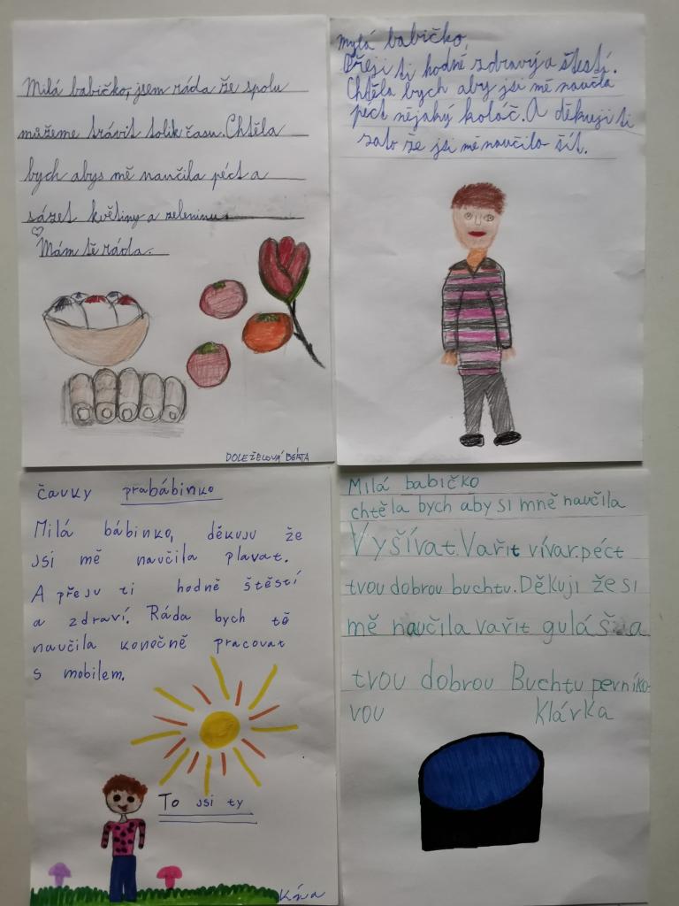 Celý den jsme si všichni náramně užili. Nadšeně jsme vyprávěli o svých prarodičích, psali jim dopisy, kreslili obrázky, chlubili se jejich fotkami. Překvapilo nás, jaké měli naši nejbližší hračky, jaké hry společně hráli nebo jaké měli školní potřeby. Připomněli jsme si také, jak se máme správně k seniorům chovat.