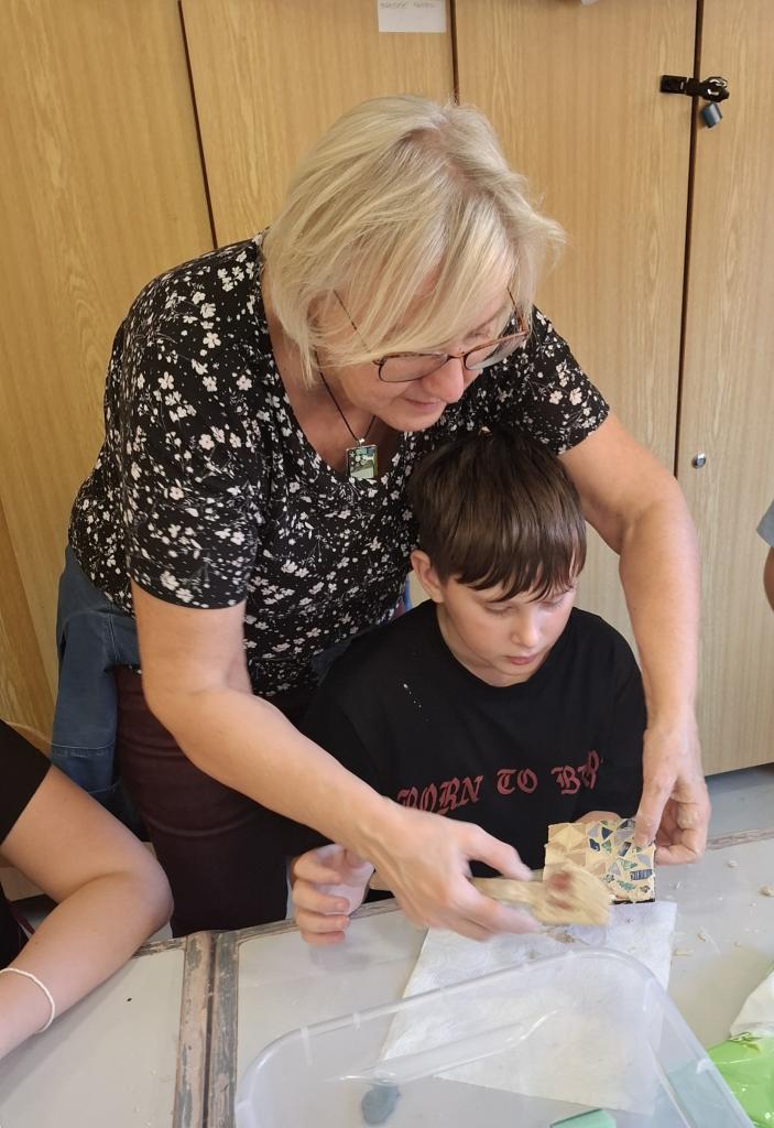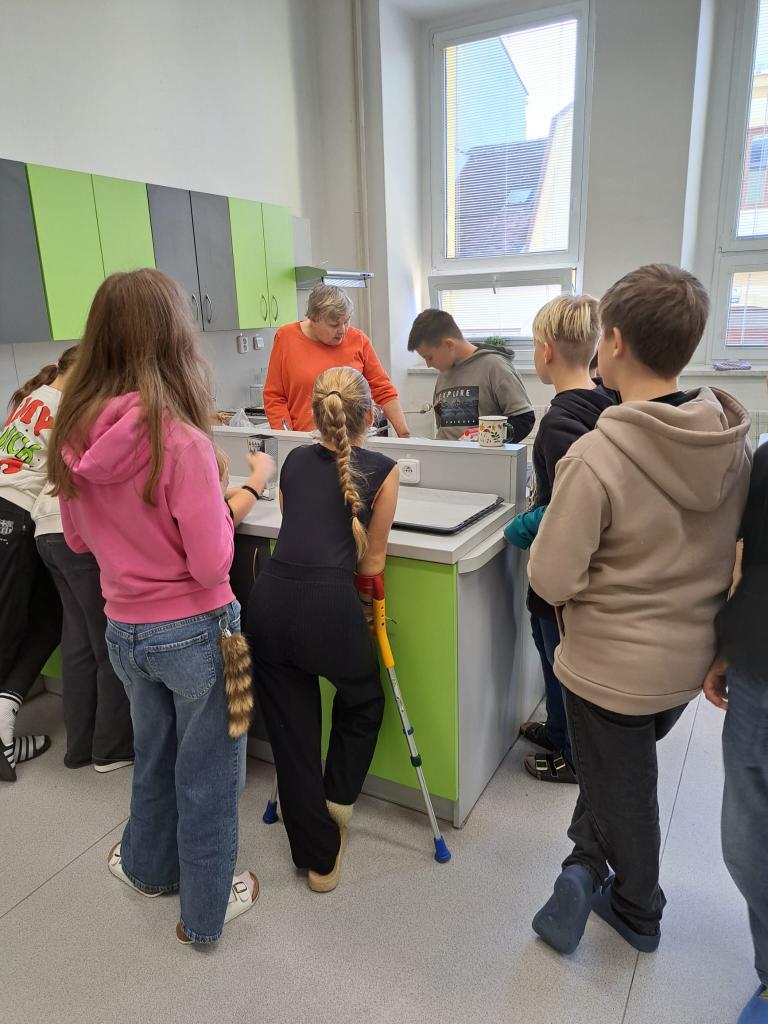 Žáci v 5.A se pod vedením paní Vlastimily Palíkové naučili novou výtvarnou techniku – mozaikování. Děti si nechaly vysvětlit postup práce a pak už s velkým zaujetím štípaly kachličky kleštěmi, lepily a spárovaly. Práce jim šla od ruky a vytvořily opravdu krásné mozaikové obrázky. Třída 5.B se ráno vydala do budovy bývalé Chronotechny, kde žáky provedl pan Bohumír Berger a přidal i odborný komentář a praktické ukázky. Žáci se tak dověděli mnoho zajímavého o historii výroby hodin. Odnesli si také dárek – mechanický budík. Ve škole si pak pro žáky připravila tvořivou dílničku paní Eva Peřinová. Společně vyráběli postavičky z bavlnky, což děti moc bavilo, a každý si domů odnesl vlastnoruční výrobek. Na závěr si páťáci upekli s paní Helenou Kymličkovou voňavý štrúdl. Pro mnohé to byla první zkušenost s přípravou tohoto dezertu.