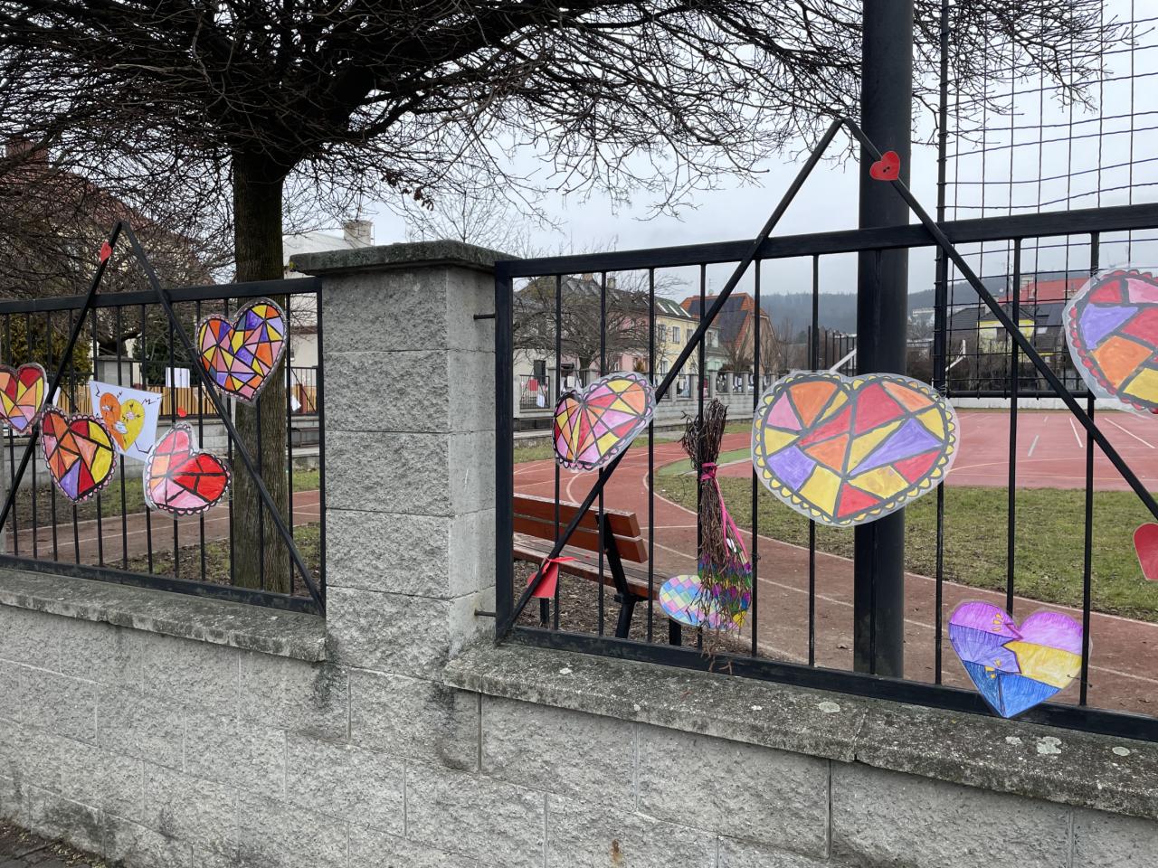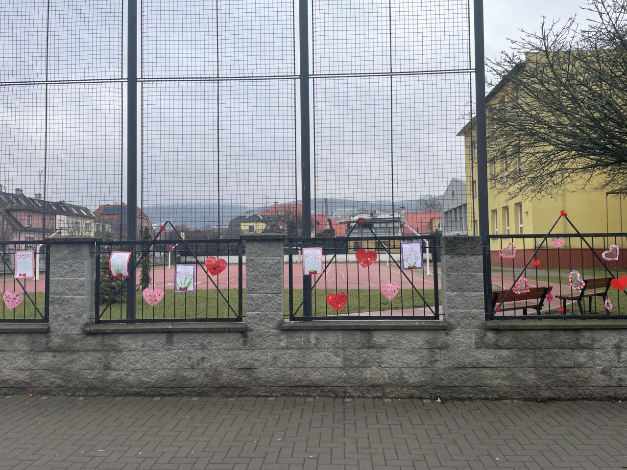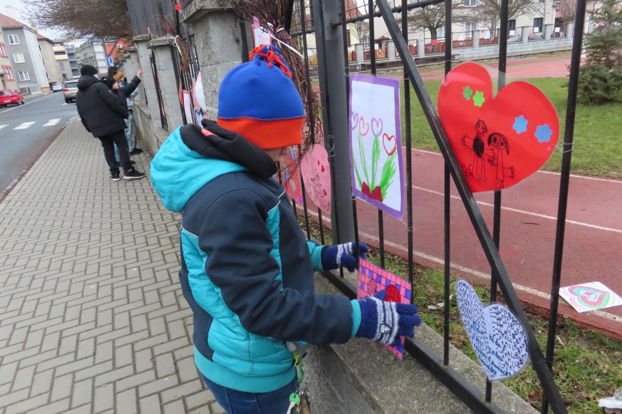 Také okolí školy jsme si společně s dětmi z MŠ Komenského vyzdobili. Plot kolem celého hřiště zkrásněl přáníčky a srdíčky, které děti samy vyrobily. Poněvadž tento rok vyšel svátek na sobotu, valentýnky roznesly naše „valentýnské pošťačky“ do tříd a sboroven až v pondělí. Své valentýnky dostaly také paní učitelky, vychovatelky, asistentky a páni učitelé! Přáníček se sešlo opravdu hodně, valentýnská krabice doslova praskala ve švech😊.