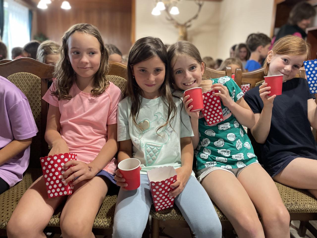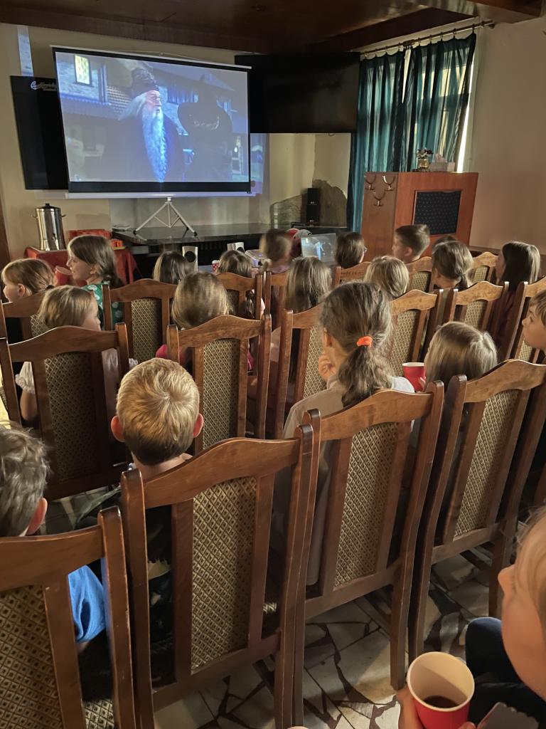 Před večeří jsme si poměřili síly v různých vtipných soutěžích a ukázali svou obratnost a smysl pro přesnost. Rozpršelo se až navečer, takže jsme se znovu uchýlili do našeho improvizovaného letního kina, tentokrát ovšem s plnou parádou - nechyběla cola ani popcorn. Pohodlně jsme se usadili a s napětím sledovali příběh ze života našeho oblíbeného Harryho Pottera.