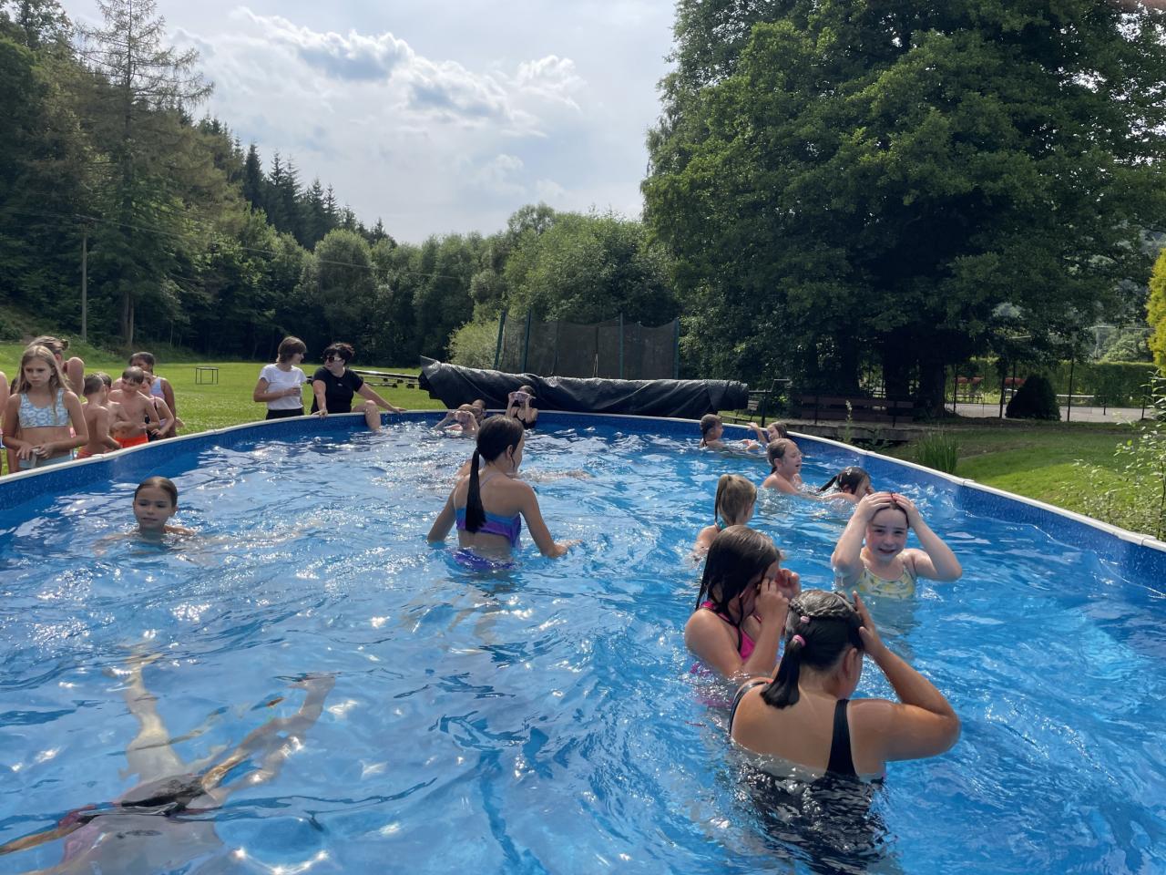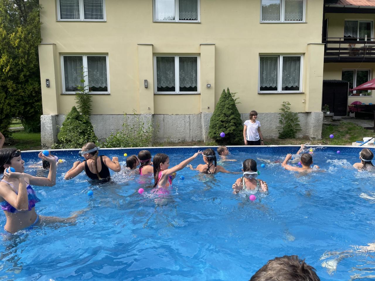 Vedro začalo být ovšem nesnesitelné, proto jsme se rádi zchladili v bazénu, kde jsme si zahráli míčovou hru „o nejlepší místo v bažině“. Na suchu následovaly soutěže „přesun v bažině“ a „Oslíkova překážková dráha“. Pak na nás ovšem Lord Farquaad, vládce Dulocku, seslal hromy blesky a my se museli běžet schovat.