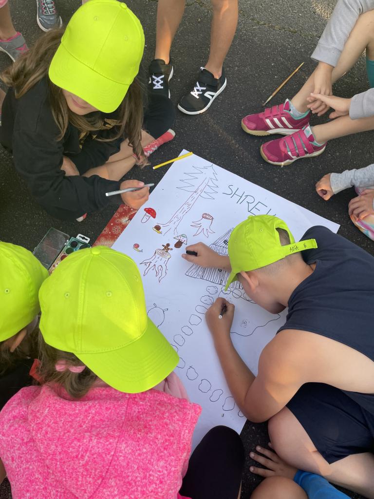 Počasí si s námi opět trochu pohrálo, a přestože jsme dorazili do horka, odpoledne nás zkoušel vydatný déšť. Ale nám to nevadilo! Náš filmový festival jsme zahájili opravdu pompézně😊. Pak se počasí umoudřilo a my mohli vyrazit ven. Tam jsme se rozdělili do filmových týmů podle získaných indicií. Dnešní den patřil filmu „Shrek“, a tak se i následující aktivity nesly v tomto duchu.