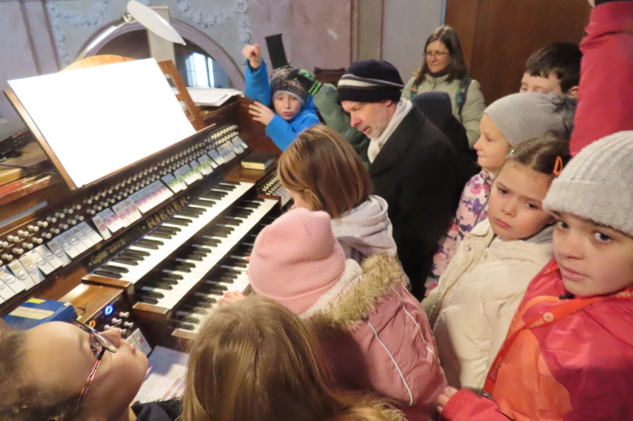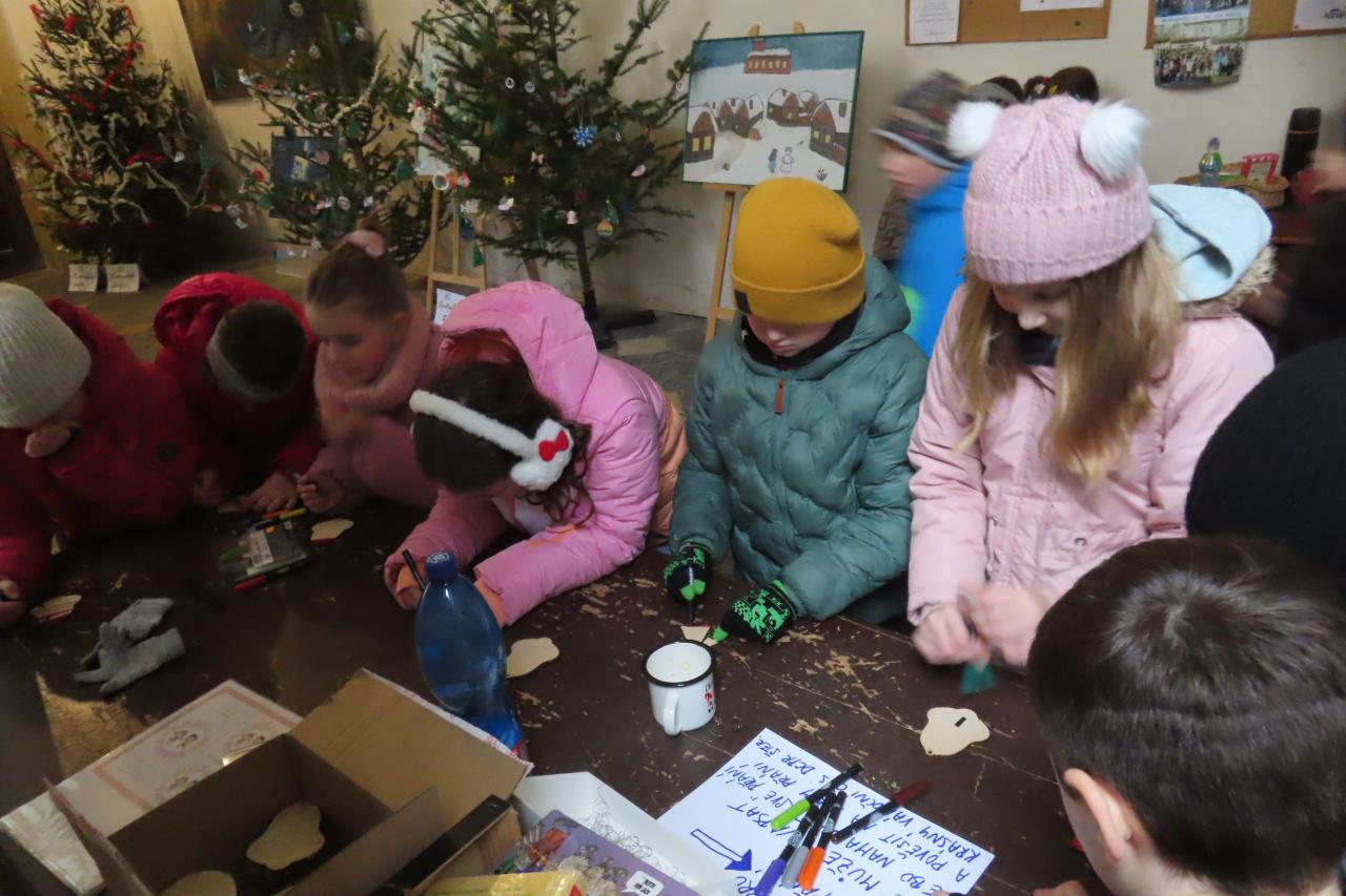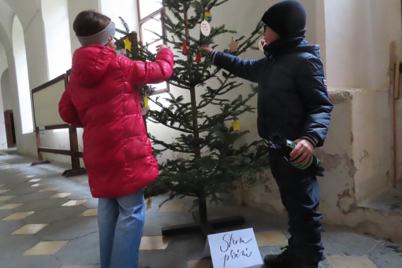 Třeťáci z áčka ozdobili stromeček se jmenovkou naší školy, tvořili dřevěné ozdoby na společný strom přání, vyzkoušeli si hru na varhany a společně si s doprovodem nástrojů zazpívali koledy u betléma.