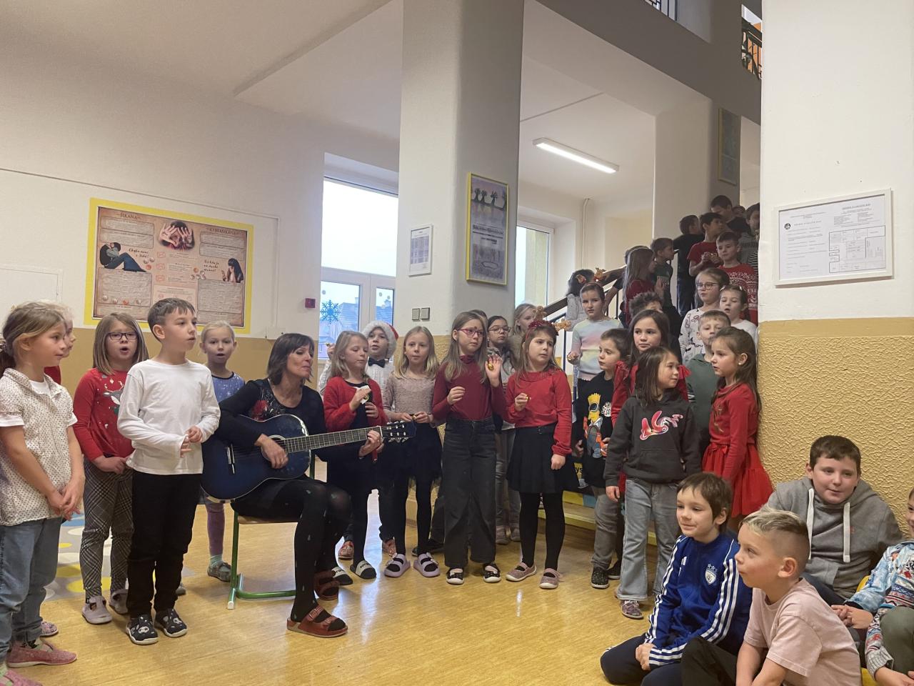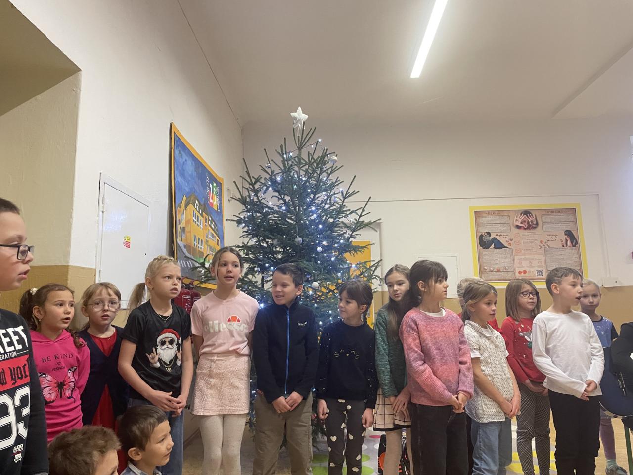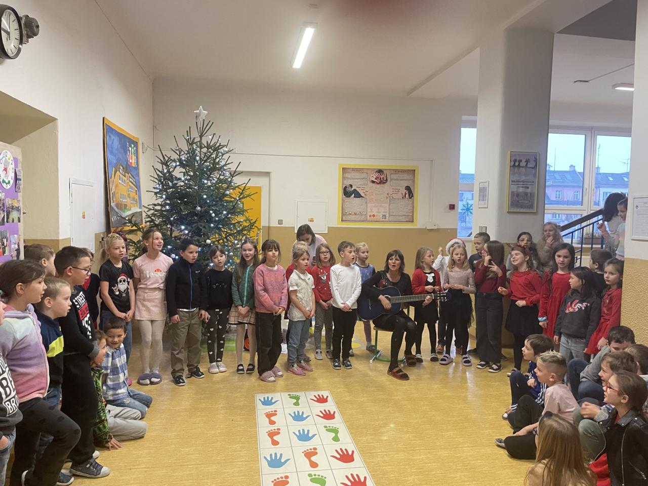 Kromě vánočního programu ve třídách a předávání dárečků jsme si čekání na Ježíška zpříjemnili tradičním společným zpíváním koled.